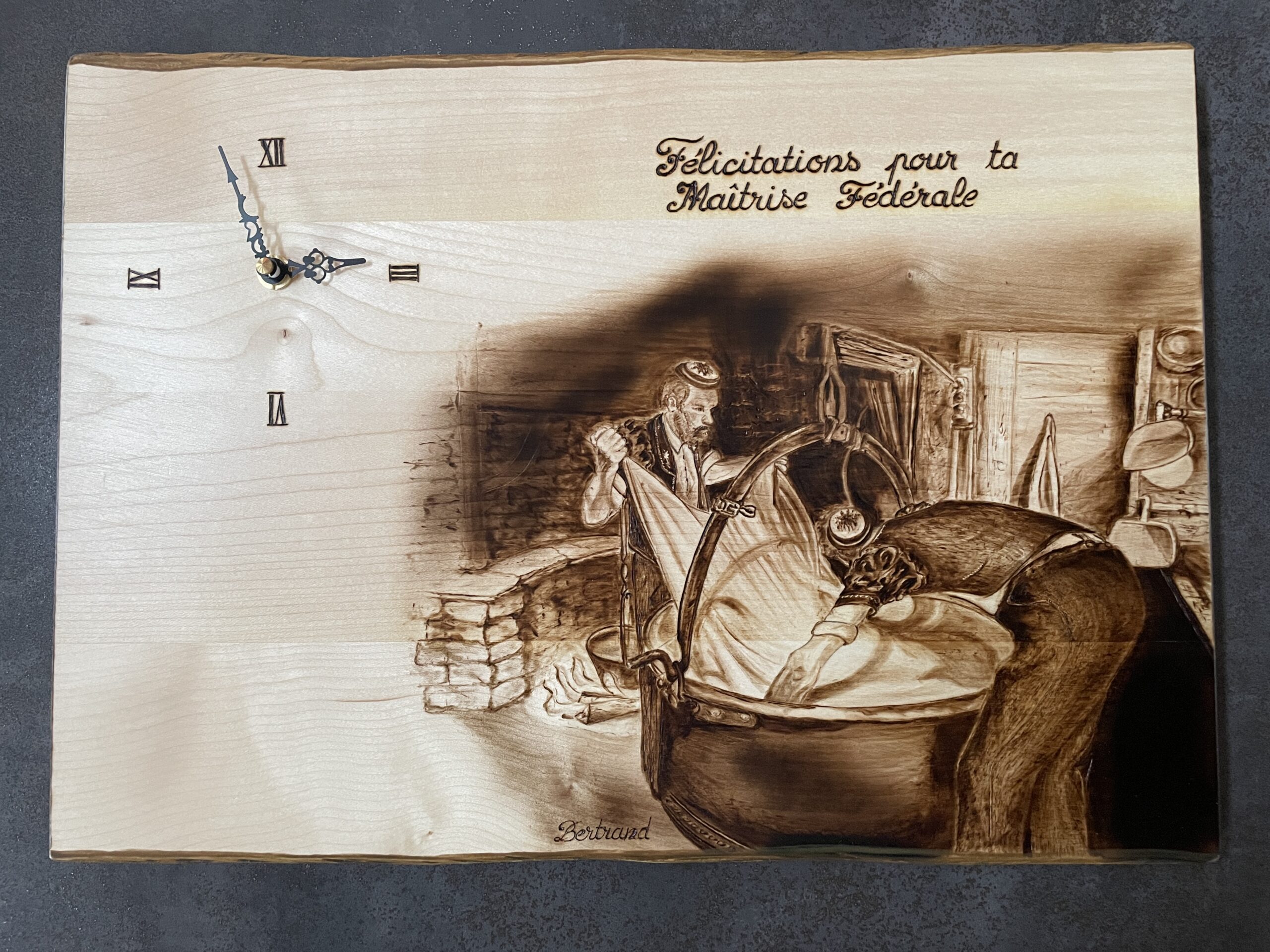 Pour mon septième anniversaire, j’ai reçu un pyrograveur simple avec lequel j’ai commencé à réaliser de petits cadeaux pour ma famille. Avec le temps, mon envie de progresser m’a conduit à investir dans un appareil plus performant, doté d’un transformateur 220 volts et d’un réglage précis de température, offrant une meilleure maîtrise des ombrages et de la qualité du trait. Les embouts interchangeables me permettent aujourd’hui de varier la finesse et la profondeur du tracé. Autodidacte, j’ai pu développer mon style et aborder une grande diversité de sujets.